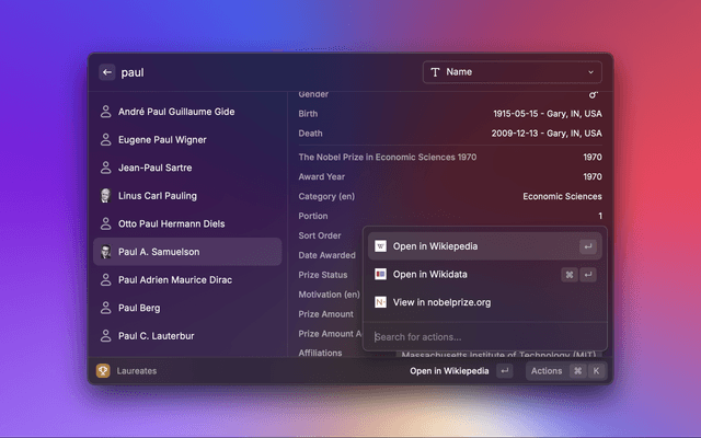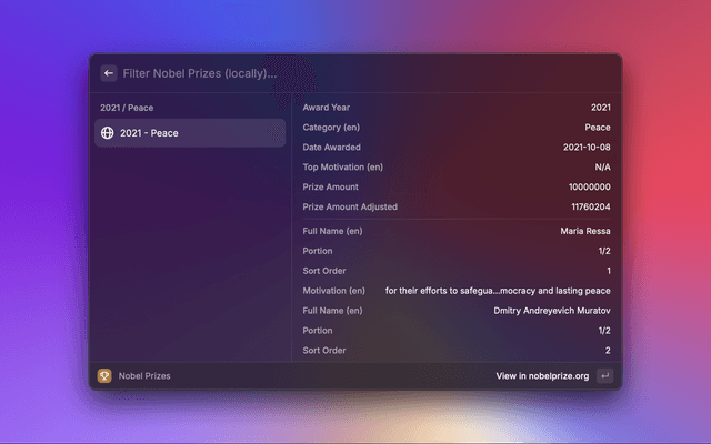Laureates - this allows to fetch Laureates and search based on Motivation and Name.Nobel Prize - this allows you to fetch Prizes with the option to specify year and/or category.