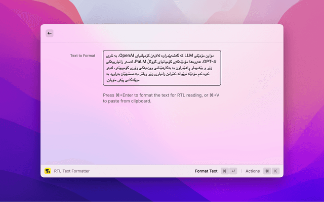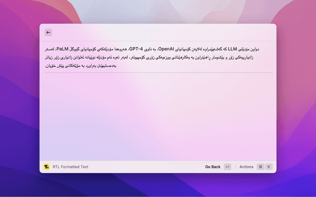 This raycast extension fixes formatting issues in texts that mix Right-to-Left (RTL) and Left-to-Right (LTR) languages, like Kurdish and English.