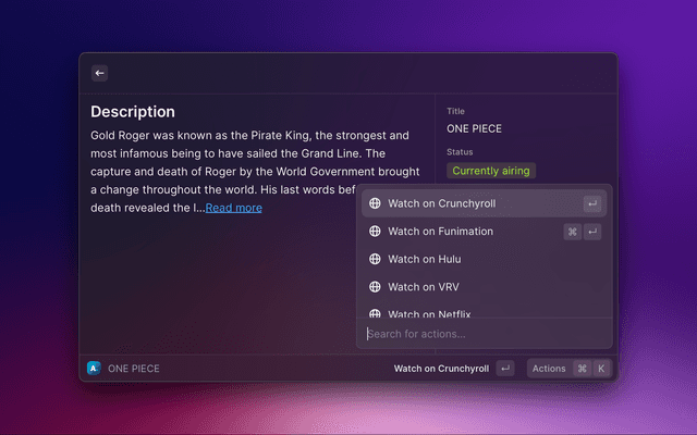 This extension pulls data from Anilist, mainly the airing schedule. Additionally, you can also open the anime to watch on one of the available streaming sites from Raycast itself.