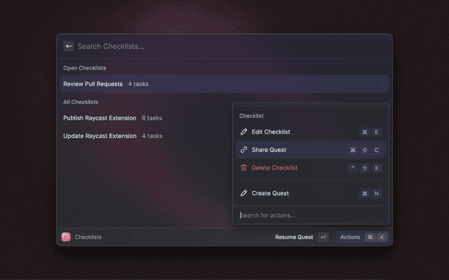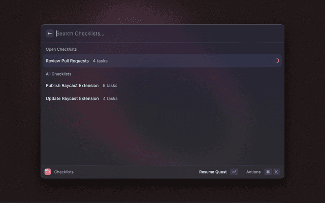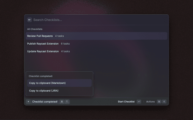 Checklist is a simple - Raycast native - app that allows you to create and work on checklists. Based on The Checklist Manifesto you know checklists can save lives and make you more productive by improving the quality of repetitive tasks. Checklist lets you create, edit and delete checklists. You can easily start working on them and keep track of the progress.